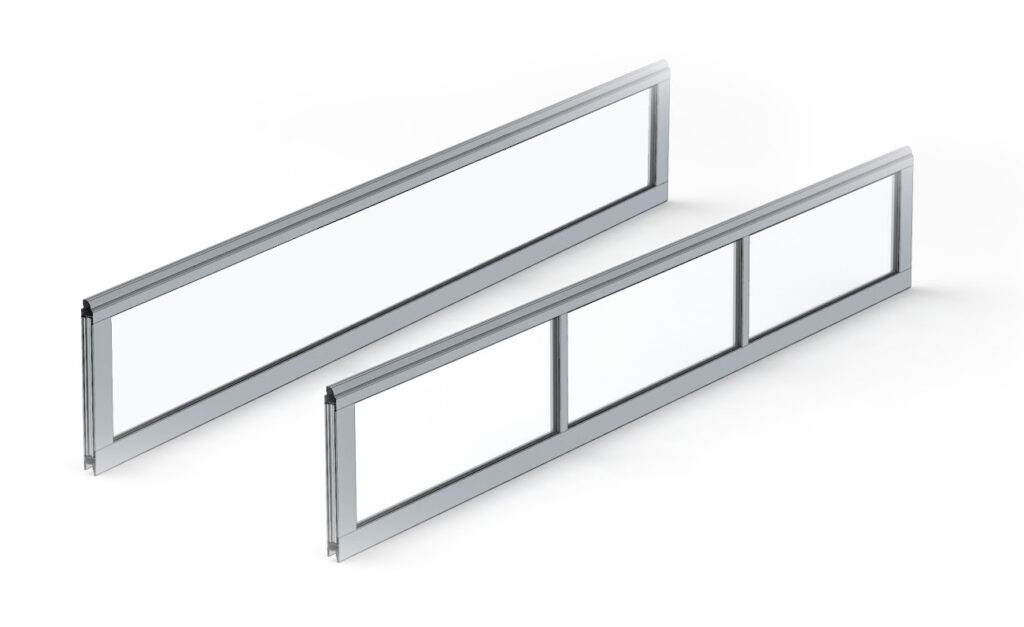 Beglazing is verkrijgbaar met verchroomde stalen (Inox) frames waarin dubbel veiligheidsglas 33.2 is geplaatst. Een tweede optie is enkele beglazing in een gegalvaniseerd stalen geschroefd frame. U kunt ook gelakte PVC kozijnen in verschillende kleuren gebruiken, voorzien van doorschijnende polycarbonaat platen.